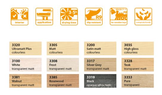 این روغن در چهار درجه براقیت مختلف موجود است: خیلی مات، مات، نیمه مات و براق. اجرای پوشش کامل تنها در یک روز امکانپذیر است، زیرا این پوشش محافظ به آسانی اعمال و سریع خشک میشود.